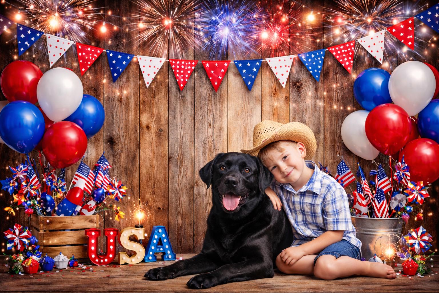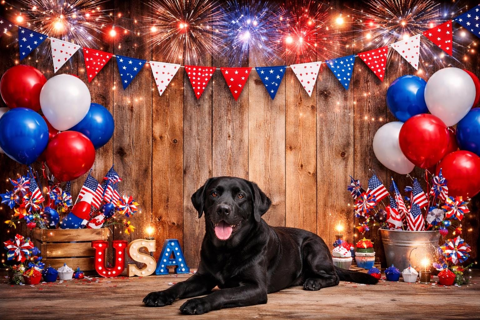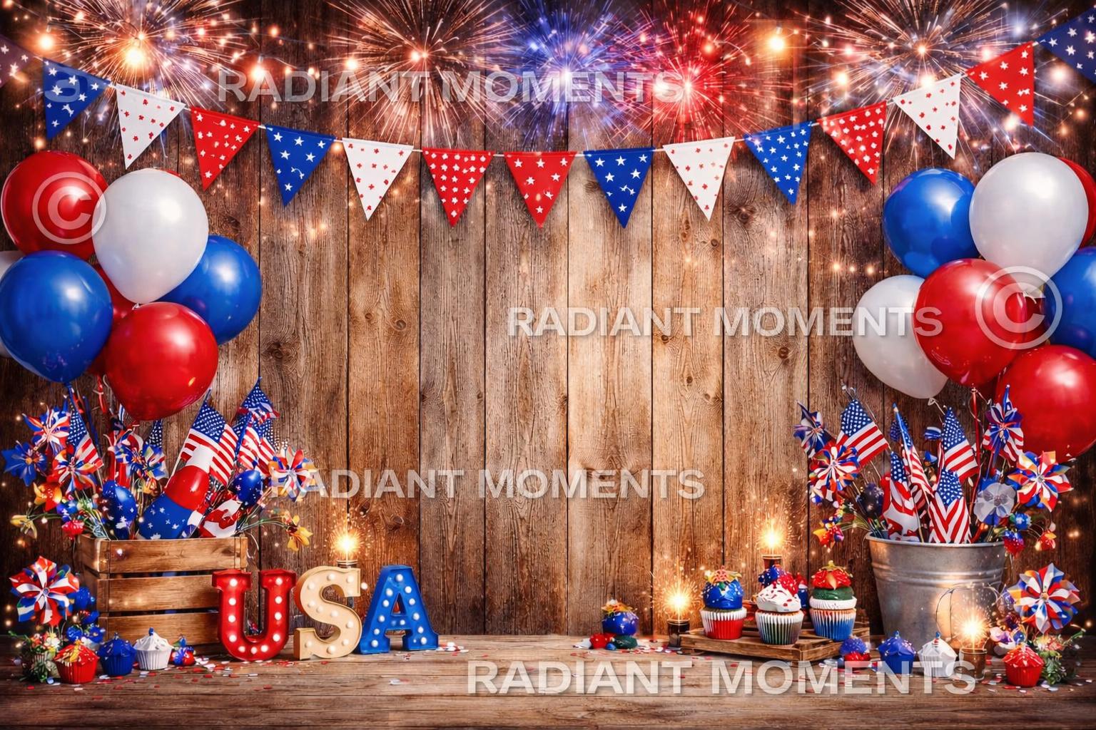 Celebrate Independence Day in classic Americana style with this vibrant patriotic backdrop featuring a rustic wood plank background, dazzling fireworks, and festive red, white, and blue décor. This image captures the spirit of the Fourth of July with bold color, nostalgic charm, and a warm farmhouse aesthetic.
